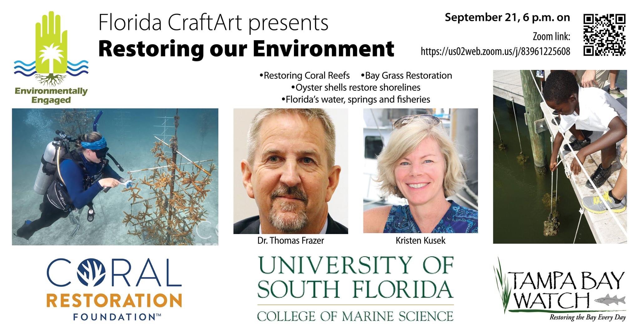 Free virtual community programming begins at 6 p.m. on Tuesday, September 21, with a panel led by Kristen Kusek of USF discussing environmental restoration from coral reefs to bay grasses. Paige Landsky of Tampa Bay Watch will talk about bay grass restoration and oyster reef installations – oyster balls and bags of oyster shells used to restore shorelines. The Coral Reef Foundation from Key Largo will reveal their project of restoring coral reefs. Dr. Frazer, dean of USF Marine Science, will examine the scientific aspects. https://us02web.zoom.us/j/83961225608